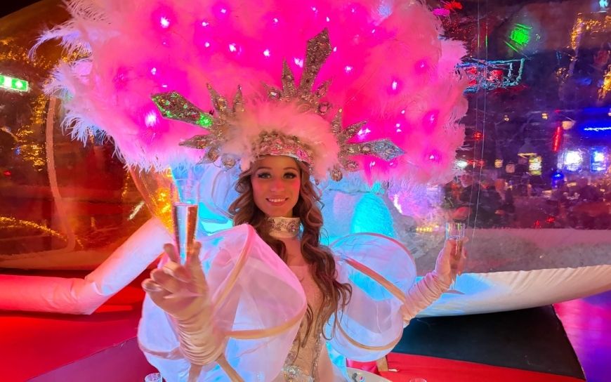 De Champagne Diva Wit met Roze LED past zich makkelijk aan elk thema aan. Of het nu om een bruiloft, bedrijfsfeest, kerstact of beurs gaat, ze voegt altijd iets bijzonders toe aan uw event.