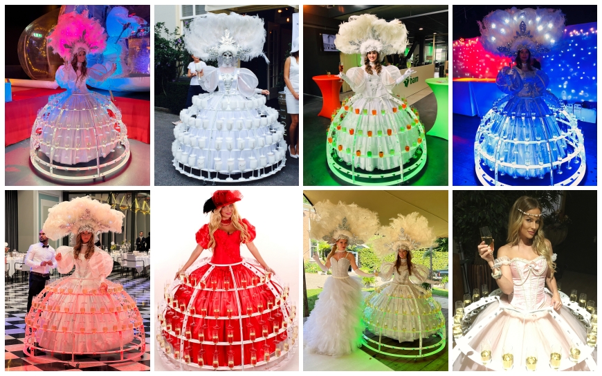 Laat uw gasten betoveren door de Champagne Diva! Met een prachtige champagne “rok” op wielen, draagt ze meer dan 100 glazen of hapjes. Een unieke en aanpasbare catering act voor elk thema. Nu met extra flair door de toevoeging van LED verlichting!