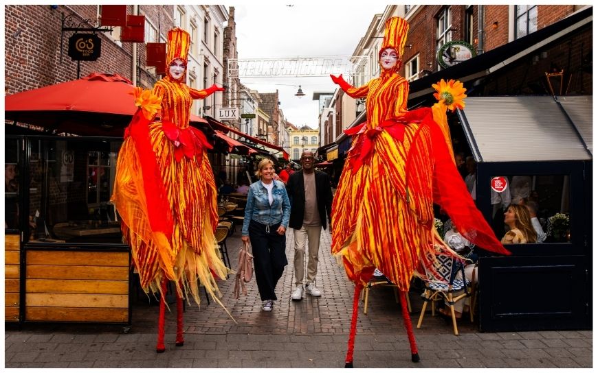 Laat je evenement stralen met de Fleurig & Vrolijk Steltenlopers. Kleurrijk en verrassend, perfect voor het uitdelen van flyers of als circusact.