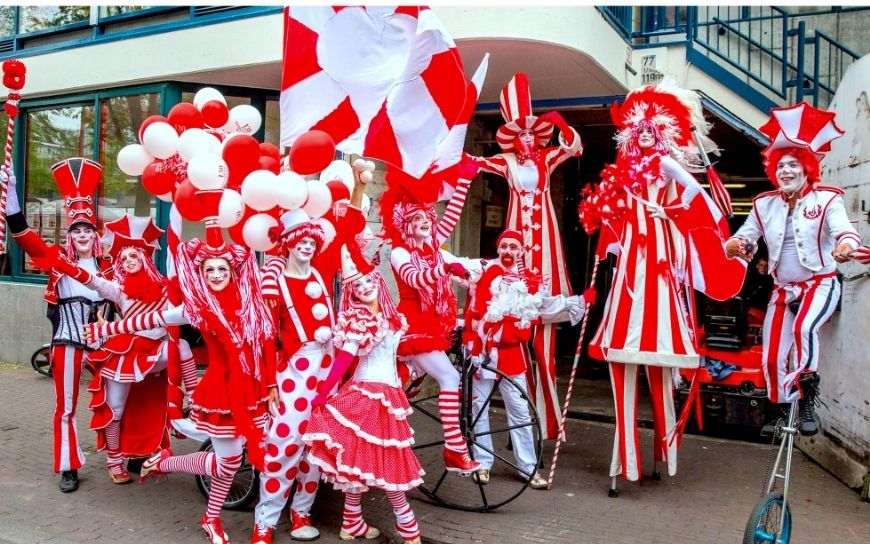 De Miss & Mister Rood-Wit Steltenlopers zorgen voor vrolijke chaos op elk evenement. Hoog boven het publiek bewegen ze door de ruimte in hun rood-witte kostuums. Met humor, bellen en speelse bewegingen trekken ze meteen de aandacht.