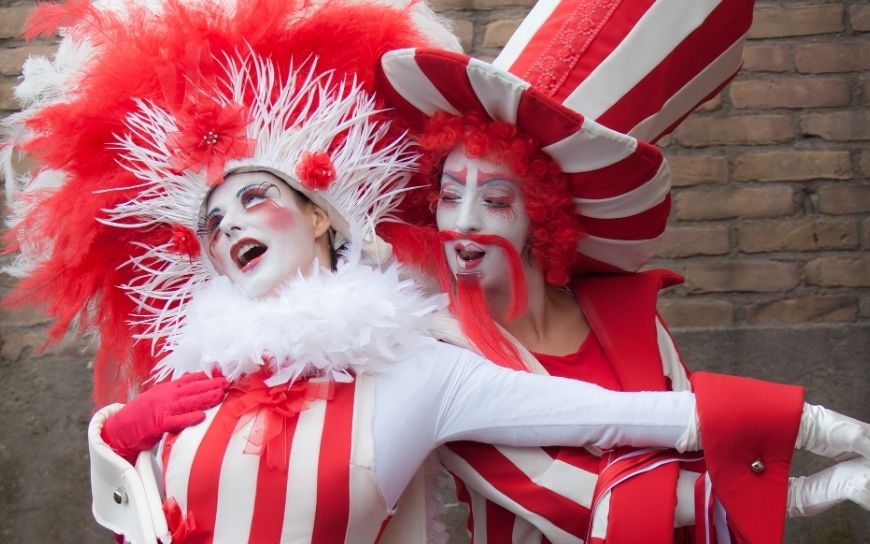 Deze rood-witte steltenlopers passen perfect bij festivals, winkelcentra en evenementen met een circus- of liefdesthema. Een mobiele act die meteen leven brengt in de ruimte.