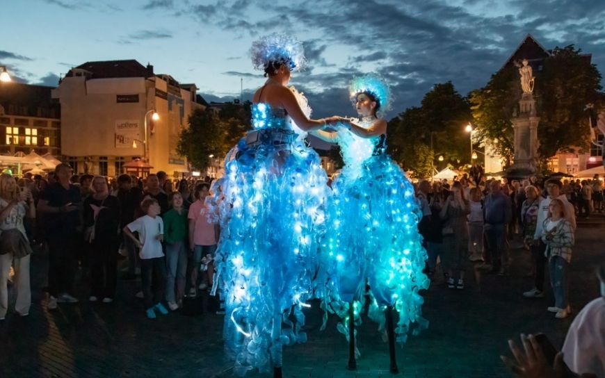 De Plastic Recycle Steltenlopers zijn een opvallende act op hoge stelten, met kostuums gemaakt van gerecyclede plastic flessen. Met licht, beweging en dans trekken ze direct de aandacht van het publiek.