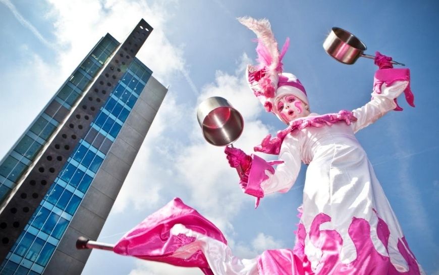 De prinses danst sierlijk op haar stelten en brengt een vrolijke en sprookjesachtige sfeer. Haar roze kostuum en elegante bewegingen maken haar een echte blikvanger.