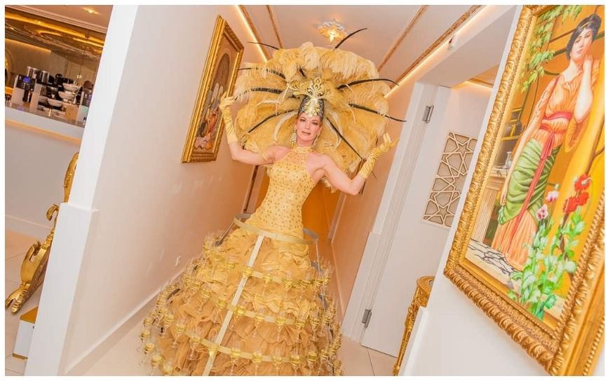 De Rijdende Champagne Jurk combineert mobiliteit met stijlvolle presentatie. Geschikt voor diverse gelegenheden zoals ontvangstentertainment, hostessen, beurs- en promotieacts, netwerkmeetings, en modellenshows. Deze act voegt een vleugje goudthema toe aan uw evenement.