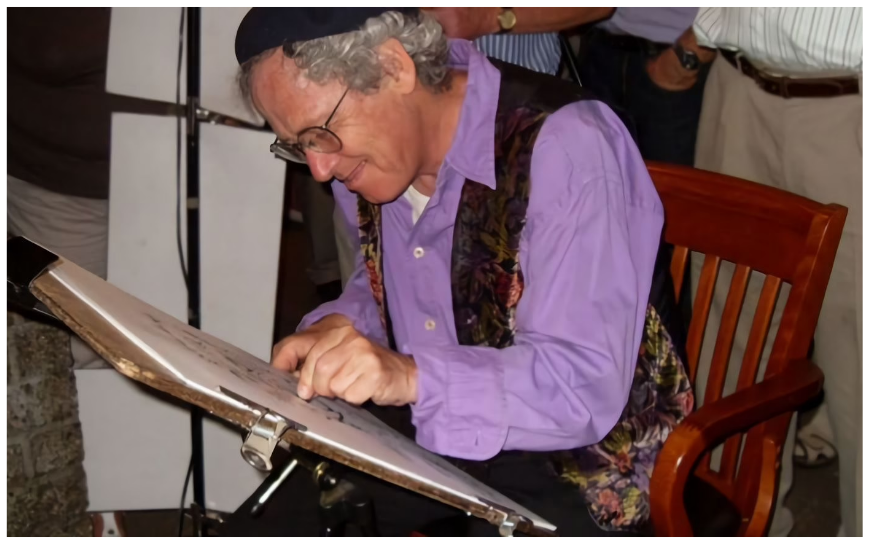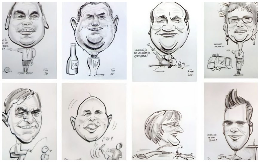 De tekenaar werkt razendsnel met inkt, zonder eerst een schets te maken. Het is indrukwekkend om te zien hoe een paar lijnen binnen enkele minuten veranderen in een grappige en herkenbare karikatuur.