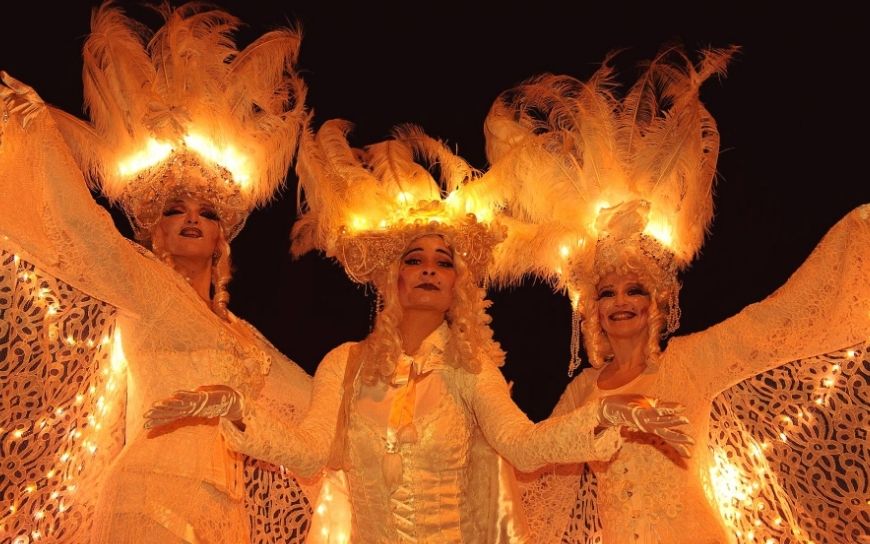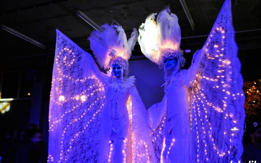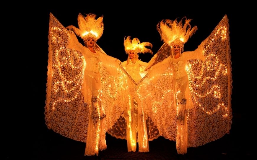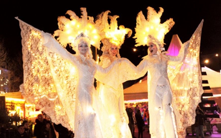 De Venetiaanse Witte Winter Engelen By Night zijn een stijlvolle verschijning in het donker. Op hoge stelten bewegen ze rustig door het publiek, met subtiele lichtjes en witte kostuums die meteen opvallen.