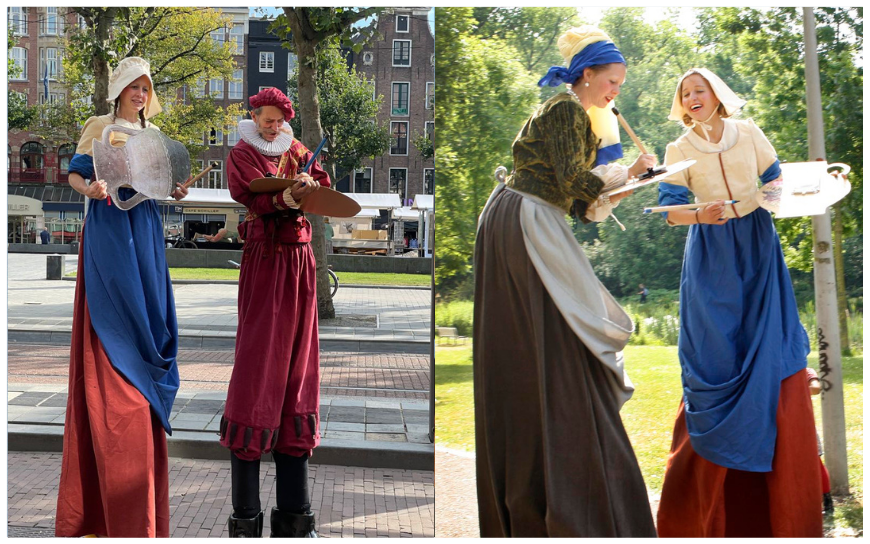 Laat de Vermeer Steltenlopers, geïnspireerd door Hollandse meesters, uw evenement betoveren. Het meisje met de parel, het melkmeisje of Johannes Vermeer zelf zoeken naar publiek om te vereeuwigen.