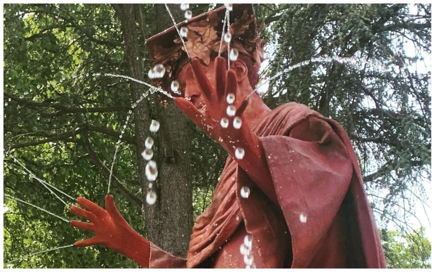 Voor buiten voegt het levend standbeeld een extra dimensie toe met het speciale effect van spuitende vingers. Een indrukwekkende visuele ervaring die het thema van vernieuwing en waterdragende krachten benadrukt.