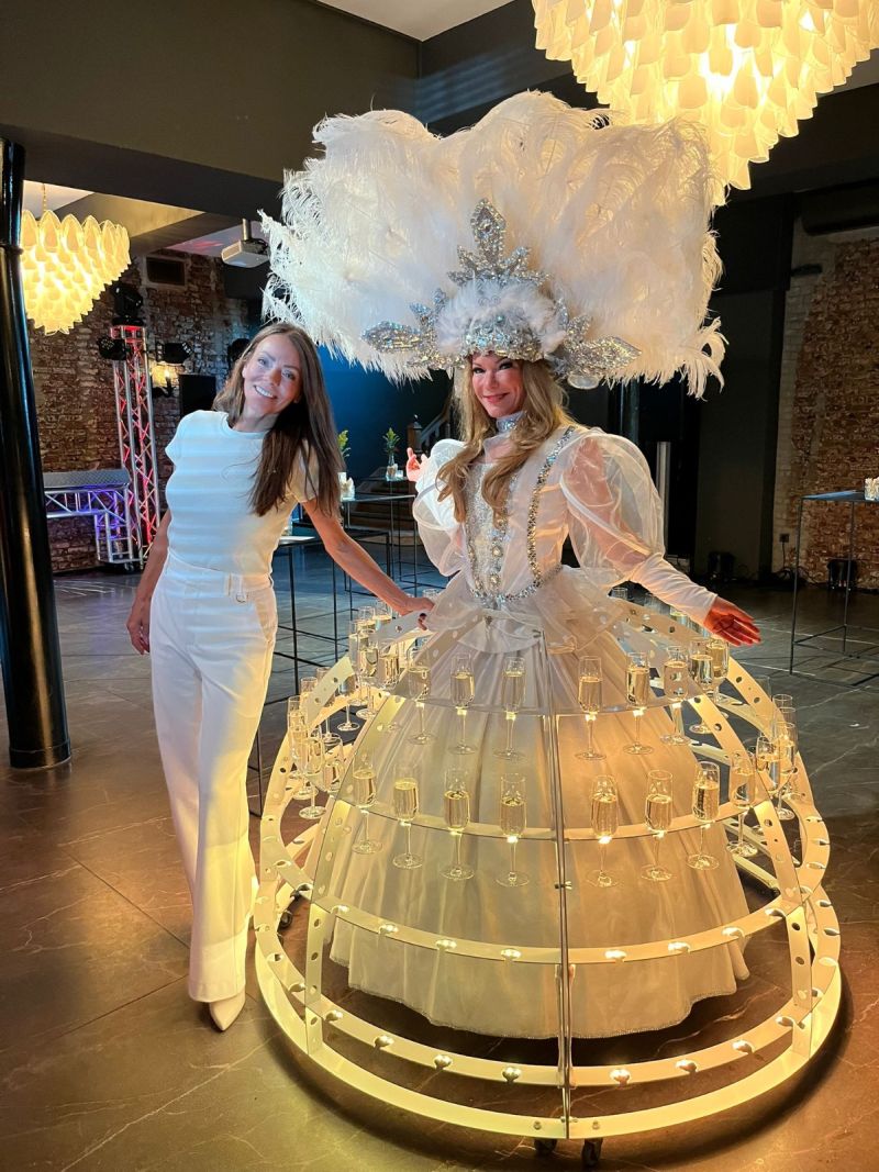 Eén van mijn eigen unieke creaties is de Champagne Diva met LED, een stralende verschijning die al meer dan tien jaar een echte blikvanger is op evenementen. Op de foto zie je mij naast deze bijzondere act, waar ik enorm trots op ben. Dit is slechts een van de vele concepten die ik heb ontworpen om een betoverende sfeer te creëren.
